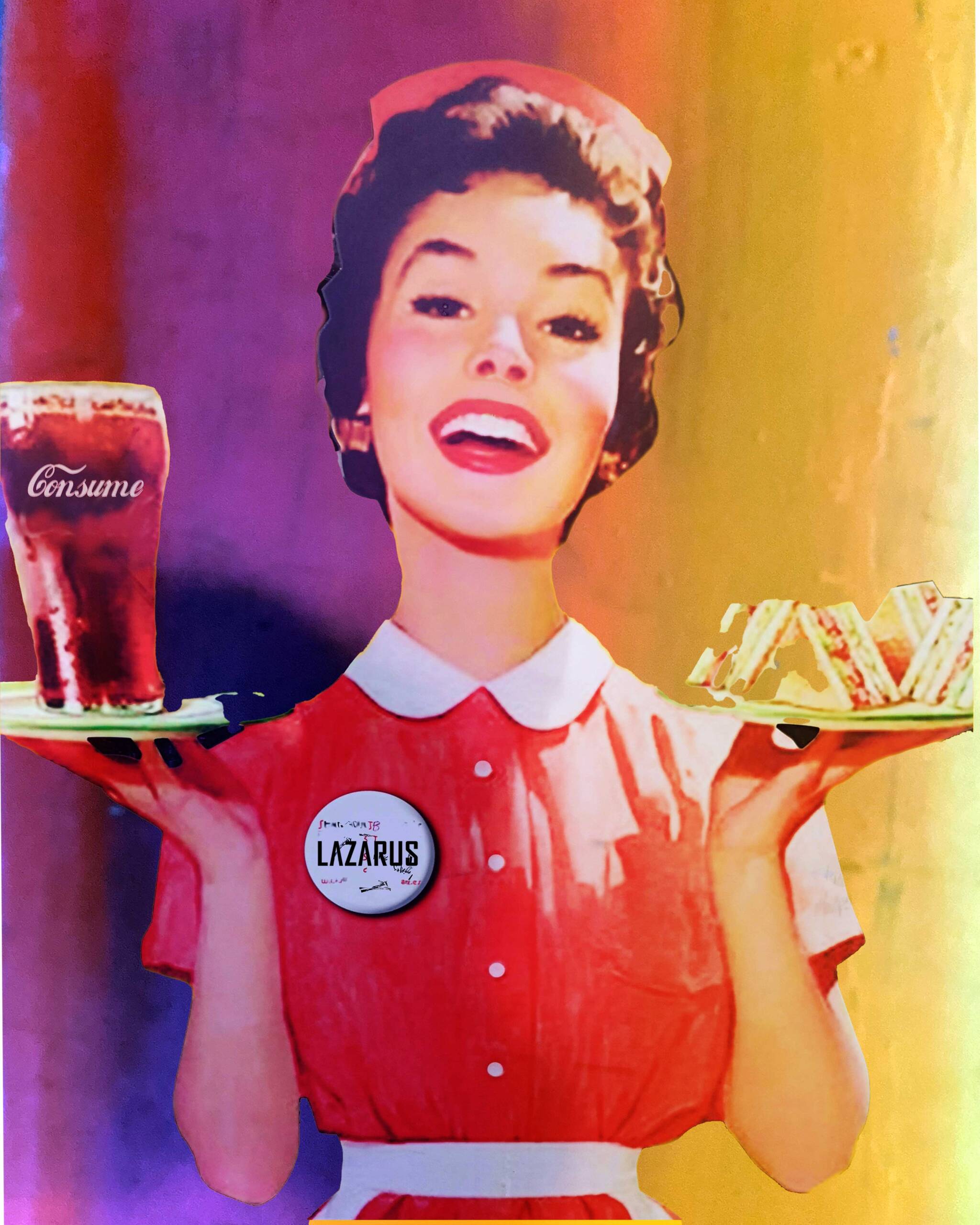 “Consume” by Lazarus Lab is a retro-inspired artwork that captures the essence of mid-20th century Americana. This piece features a stylized depiction of a classic diner waitress, dressed in a traditional red uniform and white collar, holding a tray with a glass of soda and a plate of sandwiches. The word “consume” is humorously placed on the soda glass, while the button on the waitress’s uniform reads “Lazarus,” adding a personal touch to the piece. The artwork blends nostalgia with modern commentary on consumer culture, presented in vibrant colors that evoke the era it represents.