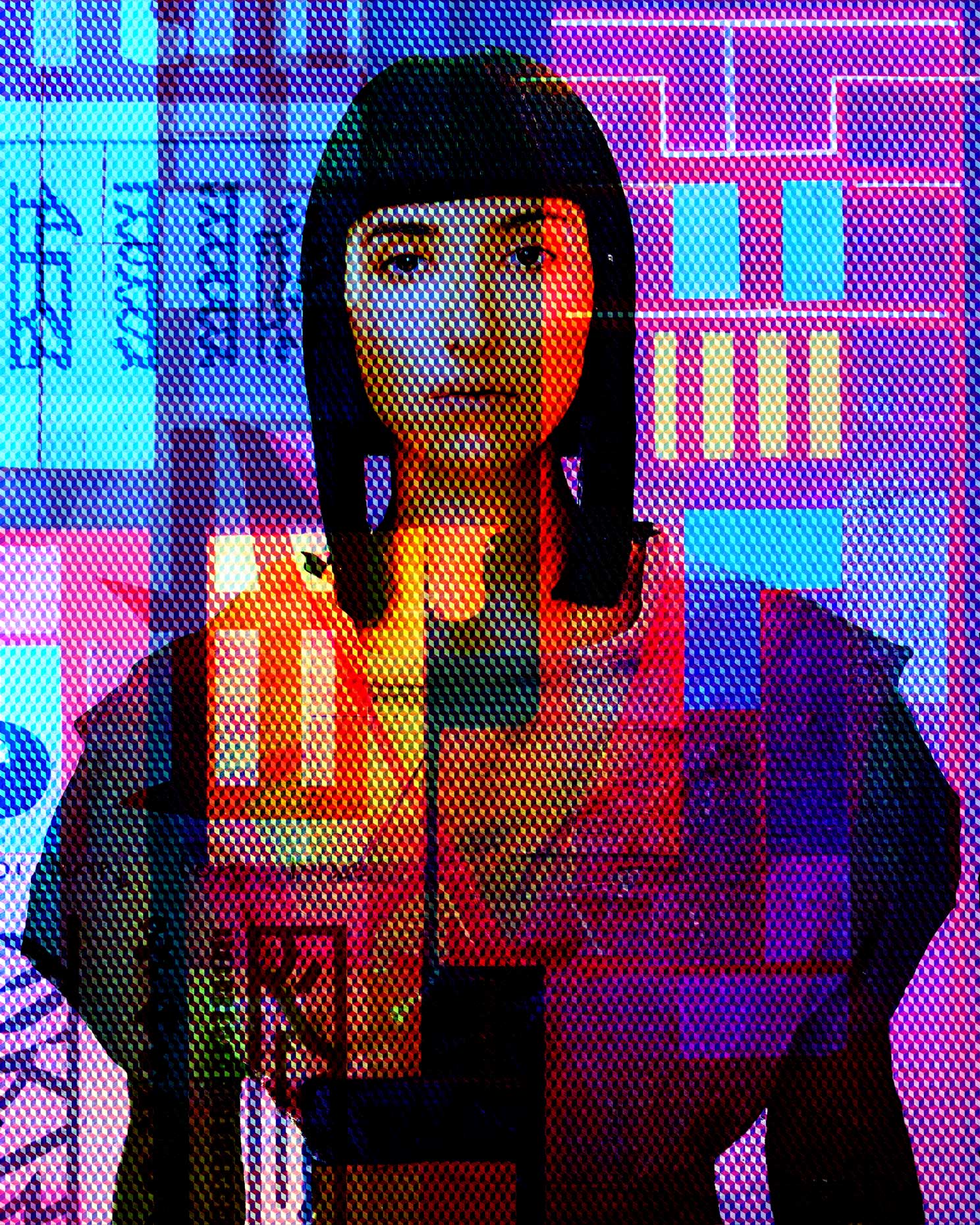 Blending elements of cyberpunk aesthetics with modern digital art techniques. The artwork features a figure set against a vibrant, neon-lit urban backdrop, reminiscent of futuristic cityscapes often depicted in cyberpunk culture. The use of bold, contrasting colors like electric blue, magenta, and yellow creates a visually arresting image, while the pixelated effect gives it a unique, digital-age texture. This piece captures the essence of a futuristic diva, embodying both the allure and the dystopian vibe of cyberpunk worlds.