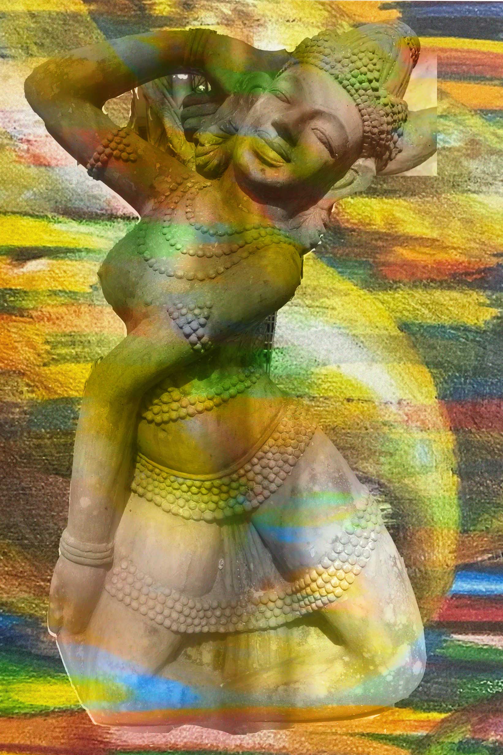 “Divine Dance” by Lazarus Lab is a vibrant and dynamic portrayal of a Hindu goddess, capturing the essence of divine energy and grace. The artwork features a statue of the goddess in a traditional dance pose, adorned with intricate jewelry and traditional attire. The background is a kaleidoscope of colors, blending abstract patterns with hints of traditional motifs, symbolizing the cosmic dance and the vibrant culture of Hinduism. This piece is perfect for those who appreciate spiritual art, cultural heritage, and the beauty of dance.